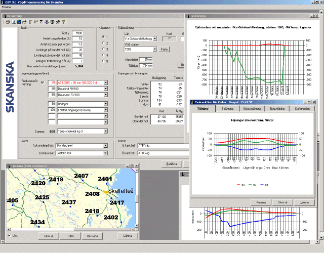 en linjärelastisk bärighetsmodell (Burmister) för att beräkna livslängder mm.